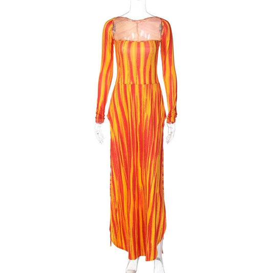 Long sleeve ruffle abstract mesh maxi dress