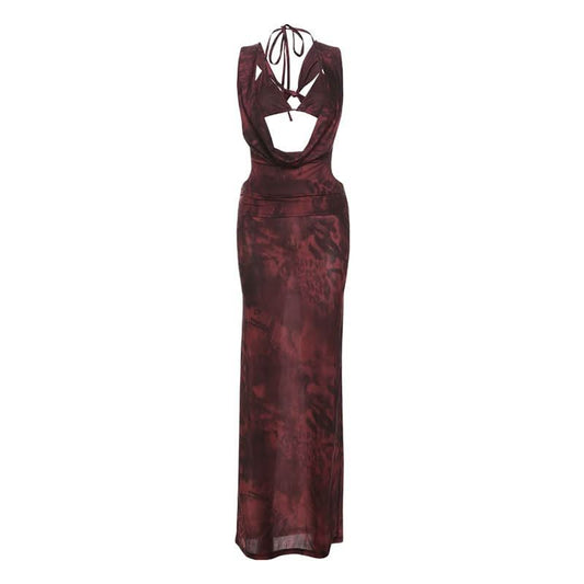 Halter cowl neck backless print maxi dress