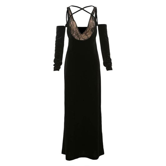 Off shoulder v neck velvet lace hem cami maxi dress