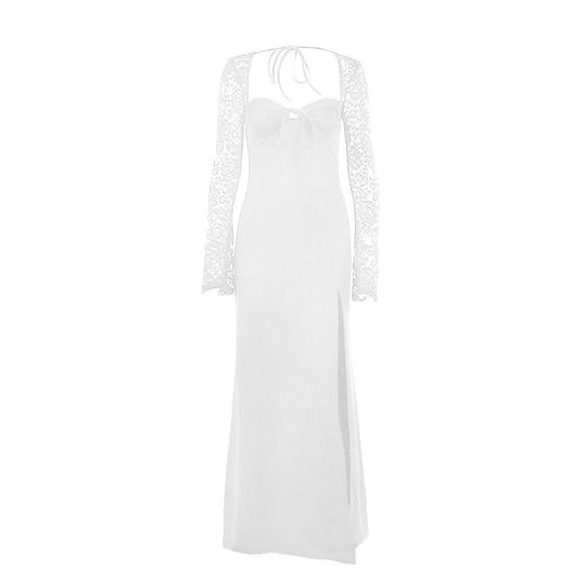 Sweetheart neck long sleeve self tie slit maxi dress