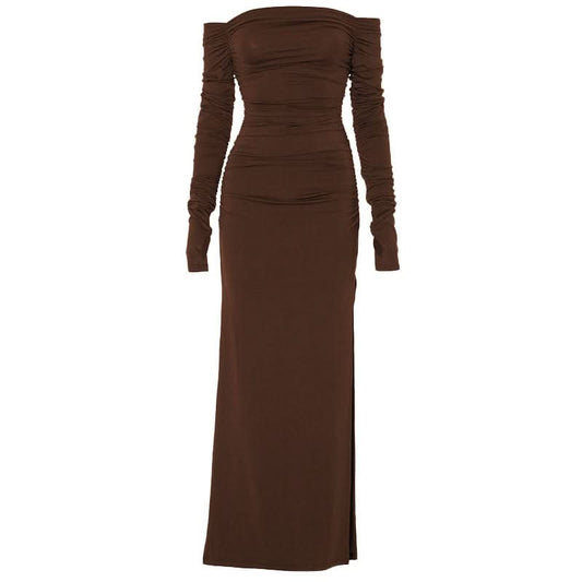 Off shoulder long sleeve slit ruched maxi dress