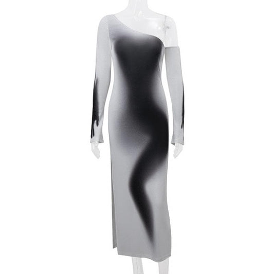 Irregular long sleeve one shoulder striped maxi dress