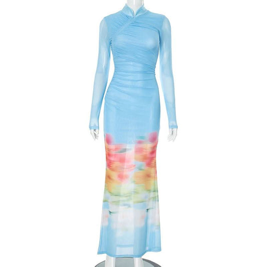 High neck long sleeve ruched mesh flower print maxi dress