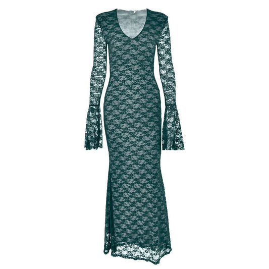 Long flared sleeve lace v neck patchwork maxi dress