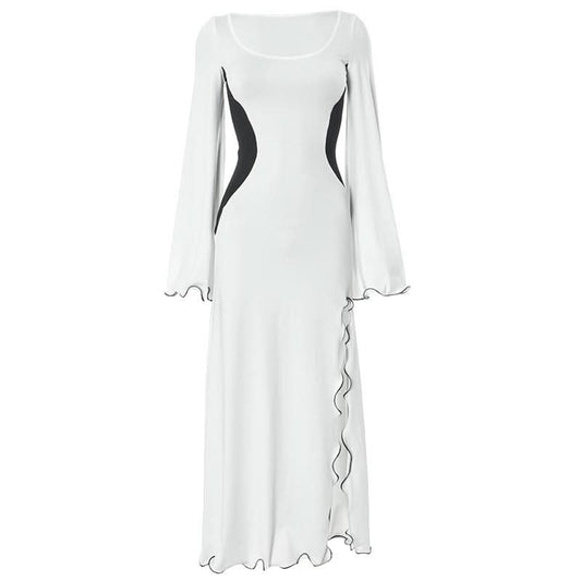 Long sleeve off shoulder contrast backless maxi dress