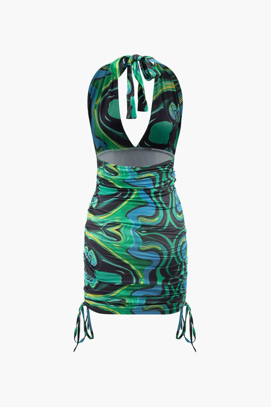 Mattey Green Printed Tie Ruched Halter Bodycon Mini Dress