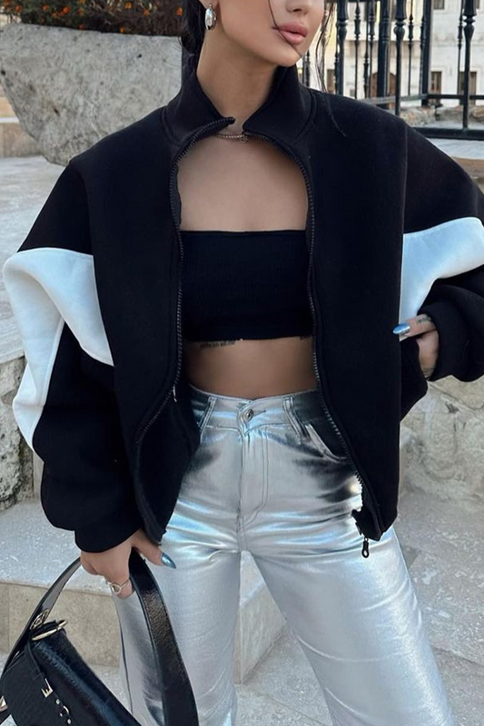 Casual Patchwork Zipper Contrast Mandarin Collar Outerwear(5 Colors)