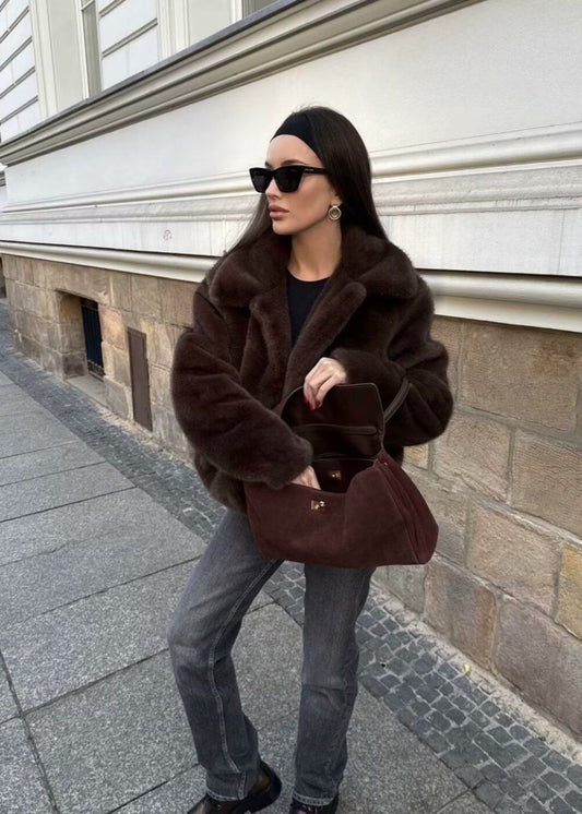 Suede-Effect Oversized Jacket with Front Pockets – Brown