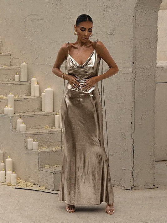 Metallic Coated Deep Neck Backless Evening Dress