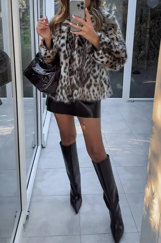Leopard Print Faux Fur Turndown Collar Fuzzy Coat-Brown