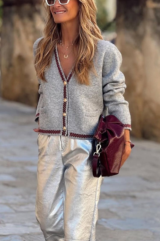Solid Color Round Neck Long Sleeve Casual Zipper Pocket Knitted Jacket