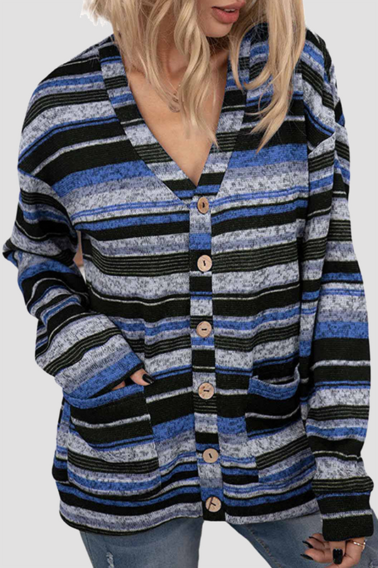 Casual Striped Pocket Buckle V Neck Outerwear(5 Colors)