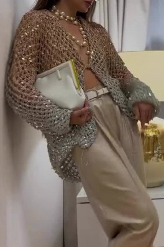 Casual Gradient Color Hollow Out Contrast V Neck Outerwear