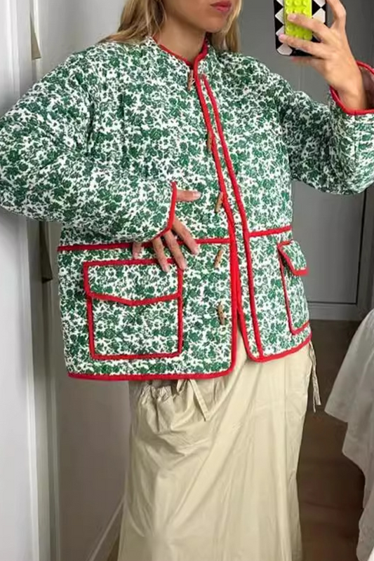 Casual Flowers Print Pocket Patchwork Contrast O Neck Outerwear