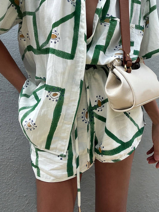 Unique Delicate Printed Loose Button Up Top Shorts Set