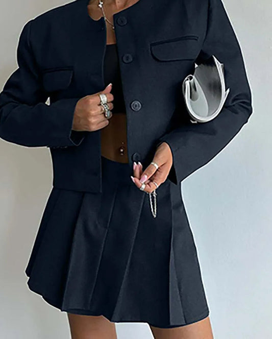 Blue Print Single Breasted Shorts Office Two Piece Set