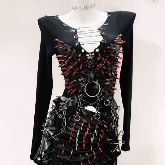 Long sleeve metal chain o ring rivet applique maxi skirt set