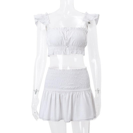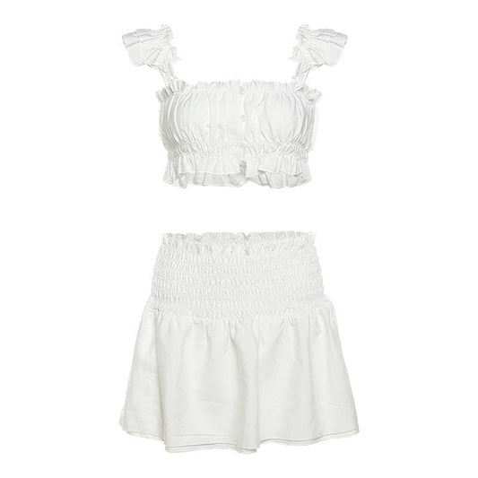 Smocked ruched cap sleeve solid ruffle mini skirt set