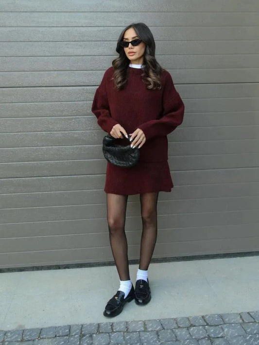 Solid Color Pullover Round Neck Sweater & Pleated Skirt Set