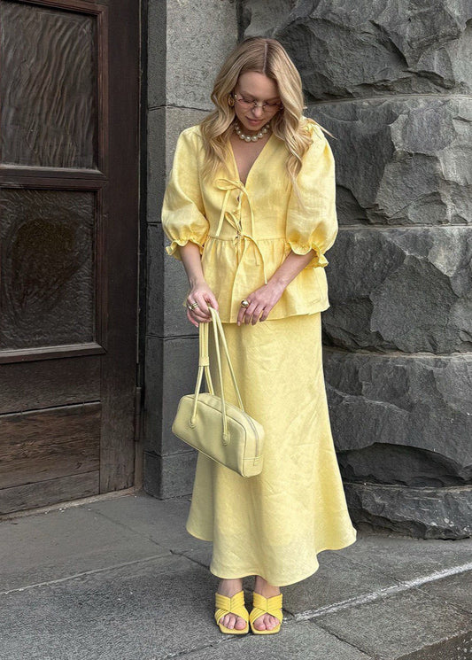 Solara - Puff Sleeve Cotton Set with Tie Waist and Maxi Skirt