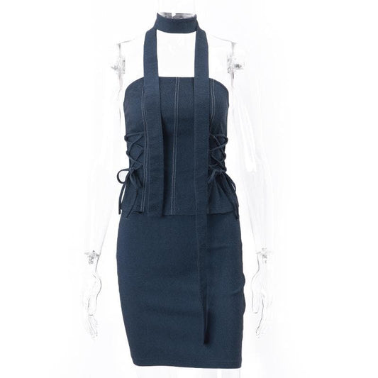 Stitch denim lace up ruched backless A line tube mini skirt set