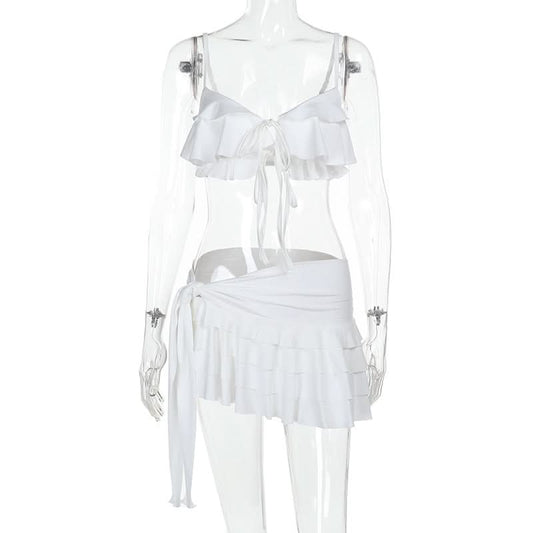 V neck Pleated Ruffle Swimsuit & Skirt Coord Set