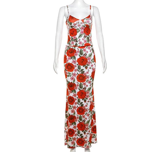 Unique Printed V-Neck Tie Cropped Top and Elastic Waist Casual Maxi Skirt Set
