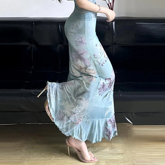Vintage Flower Print Mesh Fishtail Slim Bodycon Y2K Skirt
