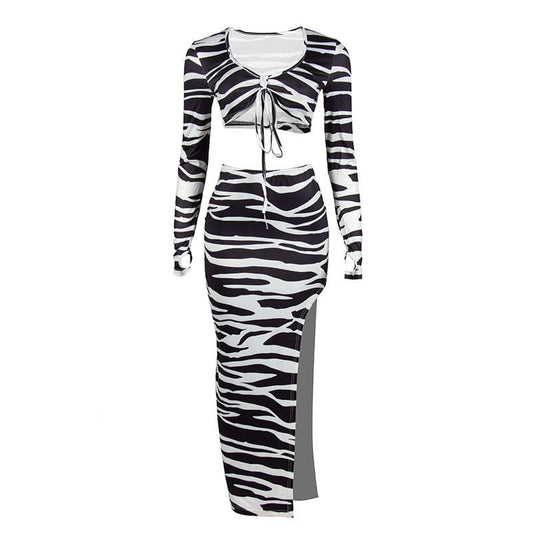 Zebra print self tie contrast long sleeve irregular slit maxi skirt set
