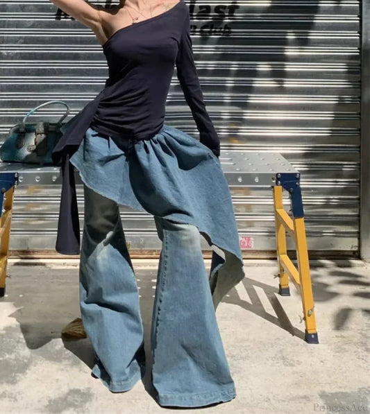 Y2K Blue Flower Patch Full Skirt Personalized Large Pocket Skirt