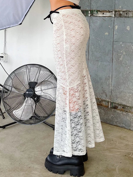 Y2K Grunge Lace Mesh See Through Bow Tie Long Skirt