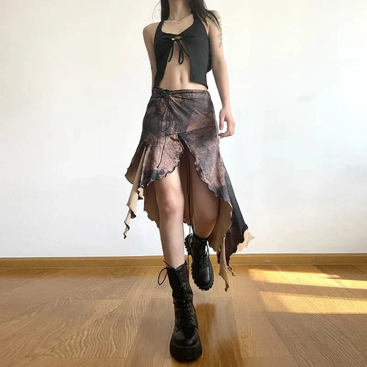 Y2K Irregular Midi Skirt Vintage Boho Ruffles Print Skirt