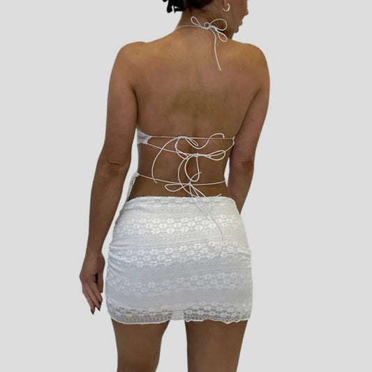 Chic V Neck Halter Tie-Up Bandage Crop Top Mini Pencil Skirt Two Pieces Set
