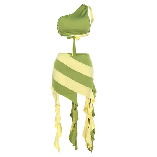 Contrast irregular one shoulder backless ruffle mini skirt set-final-sale