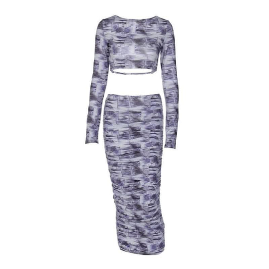 Contrast print long sleeve backless hollow out ruched cut out midi skirt set-final-sale