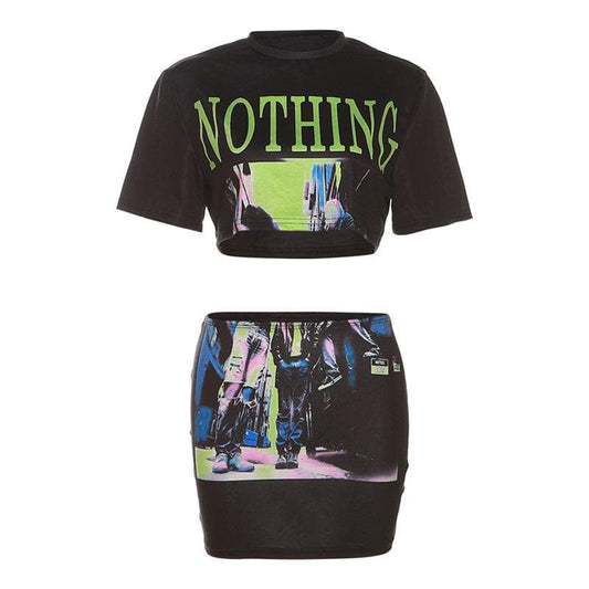 Crewneck short sleeve abstract contrast mini skirt set