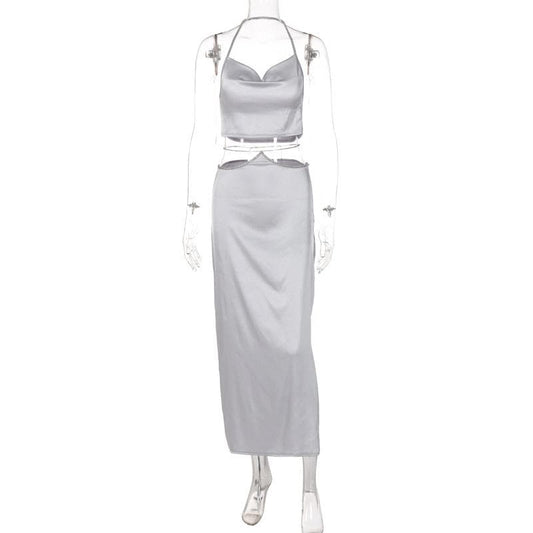 Cowl neck zip-up metal chain satin halter maxi skirt set