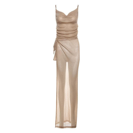 Cowl neck metallic high slit cami maxi skirt set