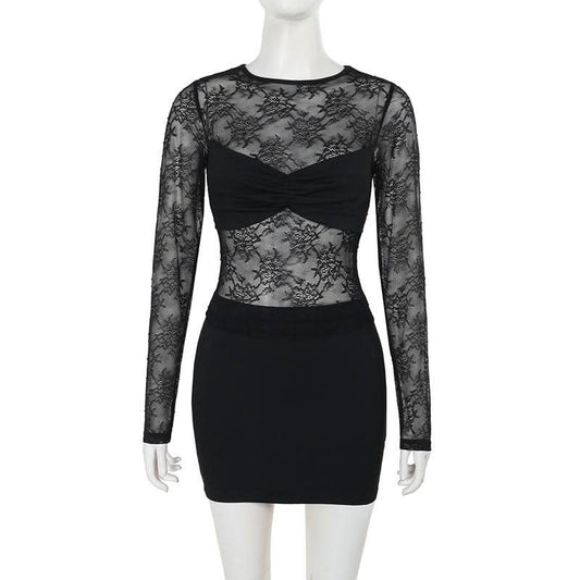 Crewneck long sleeve lace mini skirt set