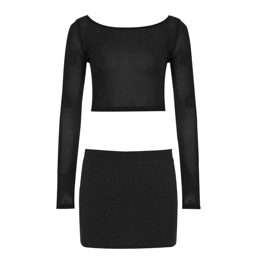 Crewneck long sleeve glitter crop mini skirt set