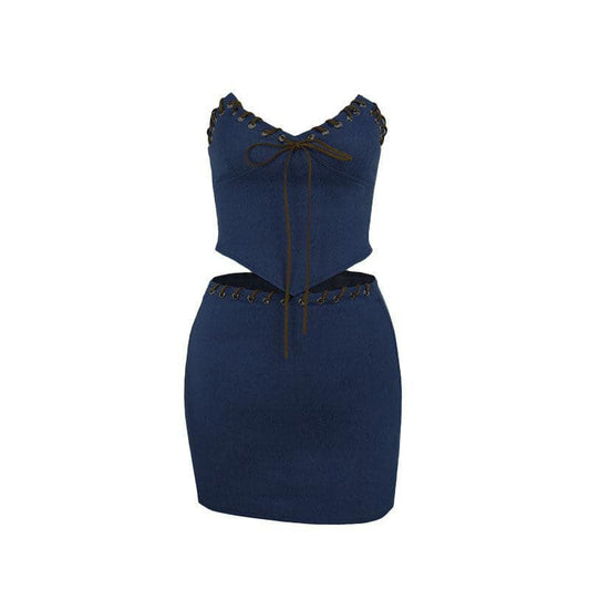 Denim Lace Up Coat & Hight Waist Midi Skirt Set