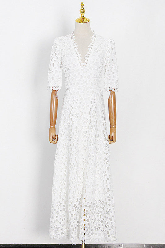 Elegant Solid Hollowed Out V Neck Waist Skirt Short Sleeve Dress
