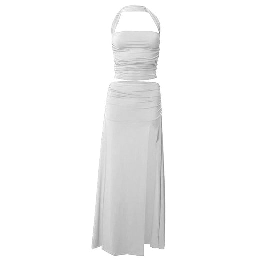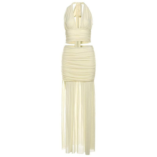 Halter ruched deep v neck high slit mesh maxi skirt set-final-sale