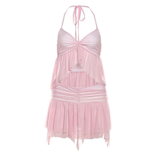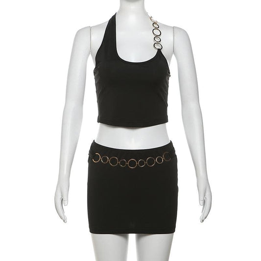Halter hollow out slit self tie irregular cut out midi skirt set