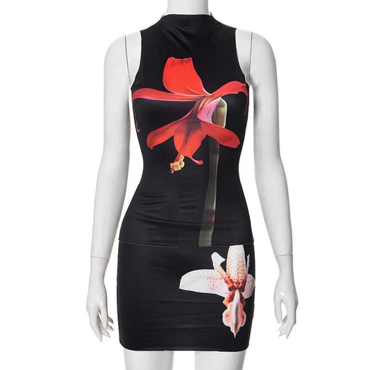 High neck sleeveless flower print mini skirt set