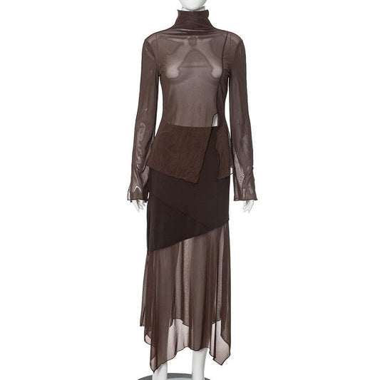 High neck long sleeve mesh slit midi skirt set