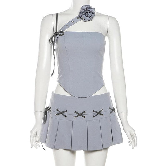 Irregular hollow out ribbon butterfly applique solid ruffle cut out mini skirt