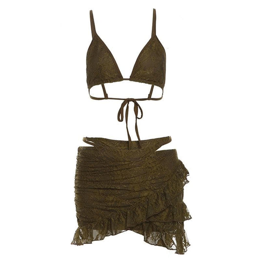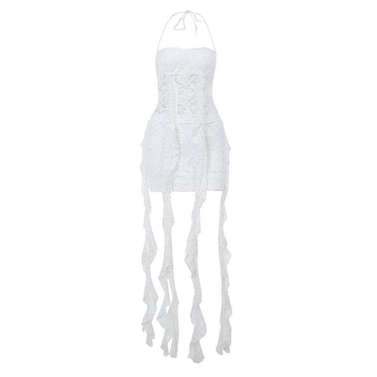 Lace ribbon hollow out solid ruffle halter backless mini skirt set