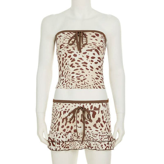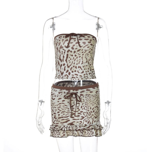 Leopard print bowknot tube mini skirt set