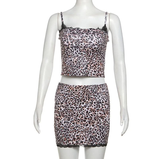 Leopard print lace hem cami mini skirt set